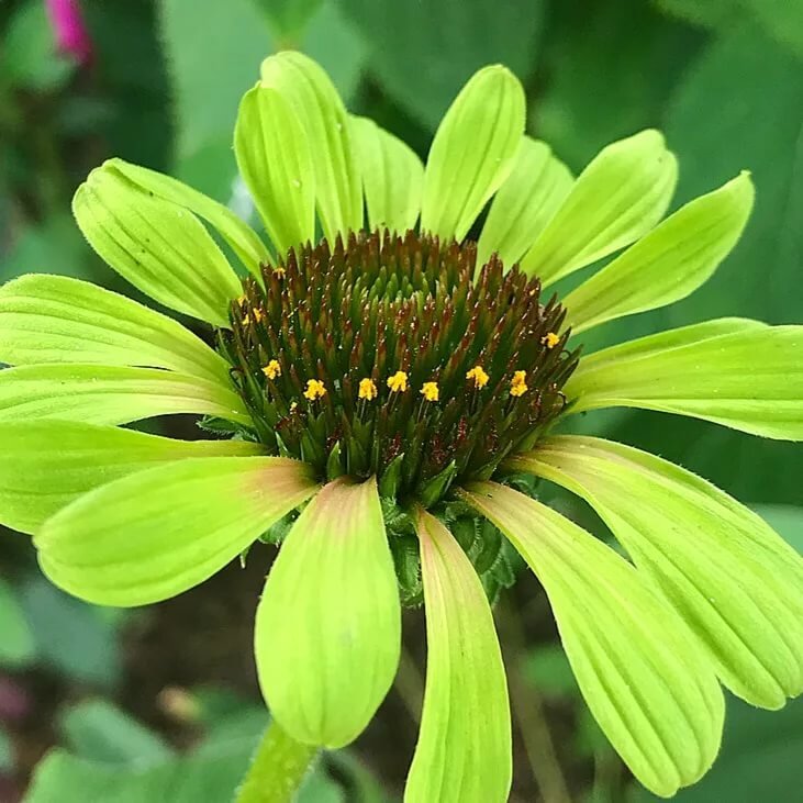 Эхинацея пурпурная Грин Энви - цветки диаметром 12 см, зелёные с багрянистыми прожилками у центра, сохраняют до конца цветения свой великолепный нефритовый оттенок. Конус чернильно-зелёный, затем коричневатый. Лепестки цветков вначале закруглённые, затем удлиняются. Эхинацея пурпурная Грин Энви пригодна для срезки и используется в качестве сухоцветов. Сорт обладает всеми лечебными свойствами также, как исходный вид.