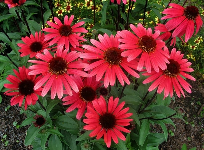 Эхинацея Solar Flair - цветки крупные, одиночные, ароматные с лепестками глубокого маджентово-красного цвета, окружающими темный конус. Зрелые цветы привлекательны оттенками дымной розы. Растения сильные и разветвленные с темными крепкими стеблями. Цветут с середины лета в течение нескольких месяцев, если выцветшие цветы регулярно удалять.