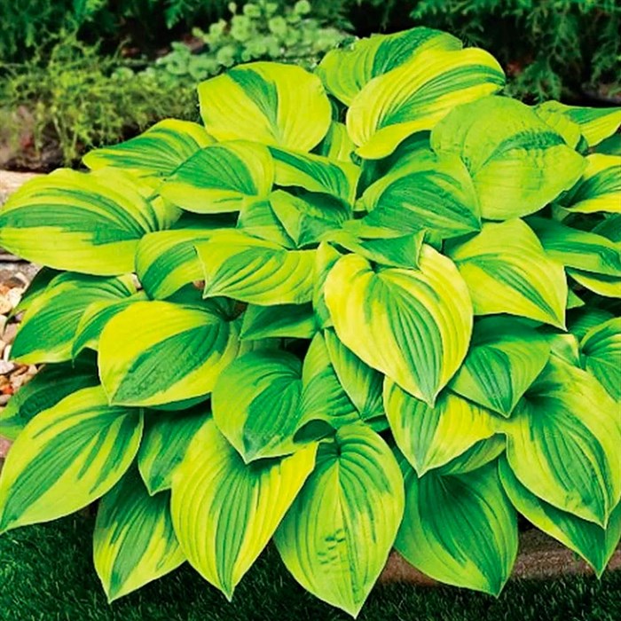 Хоста гибридная Велвет Мун хорошо приживается на новом месте и весной дает обилие молодой поросли, которая быстро формирует красивый куст с высотой около 60 сантиметров. Один из немногих сортов, листва которого устойчива к солнцу, оттенки не выгорают под воздействием солнечных лучей. Достаточно крупные листья обладают основным темно-зеленым оттенком и имеют очень широкую золотисто-желтую кайму. Цветет растение в июле бледно-лавандовыми цветками. Хоста гибридная Велвет Мун эффектно будет смотреться в ландшафтных композициях с разными растениями ― хвойными, декоративнолистными или цветущими.